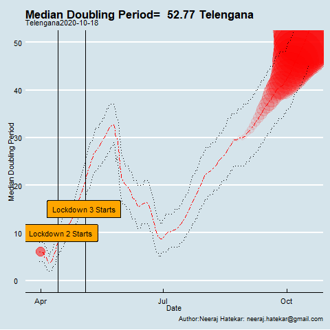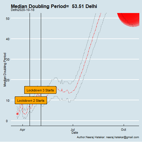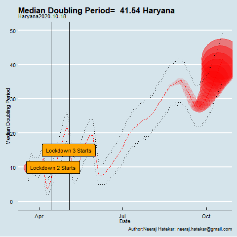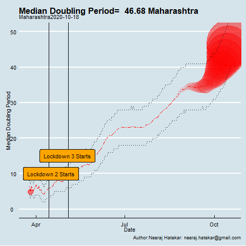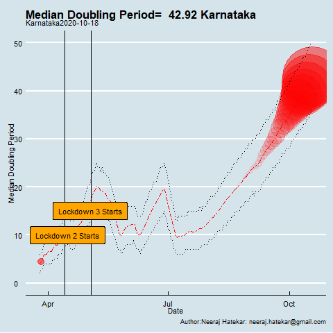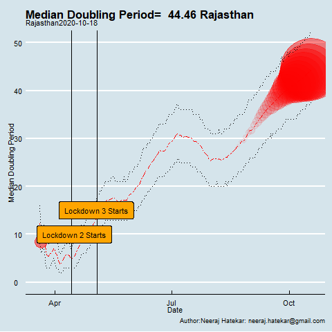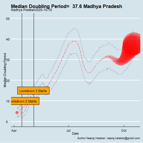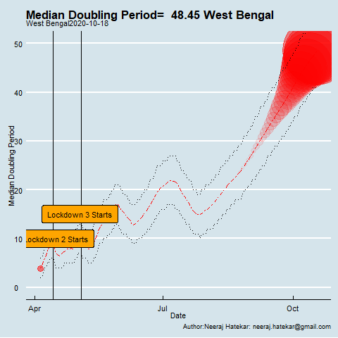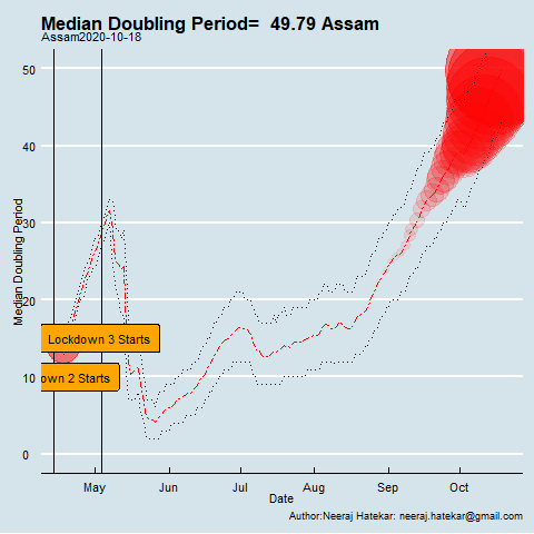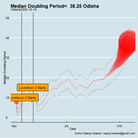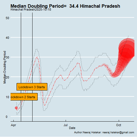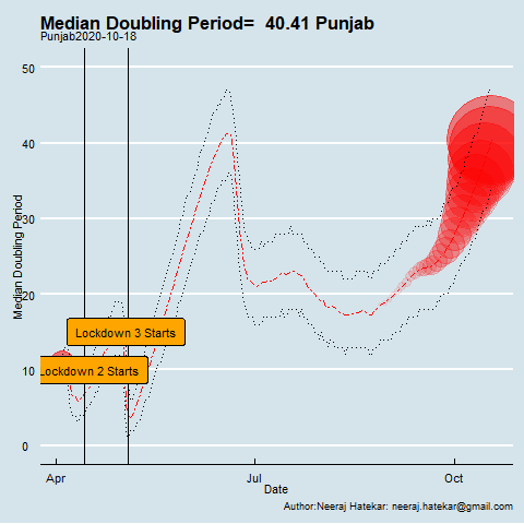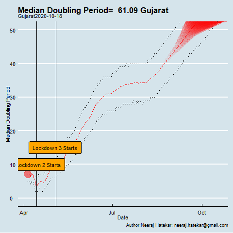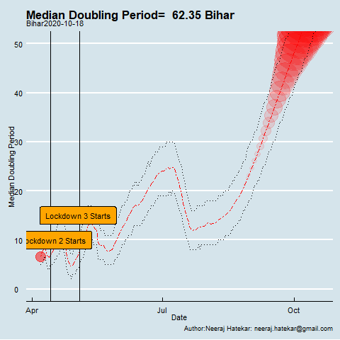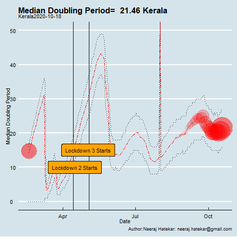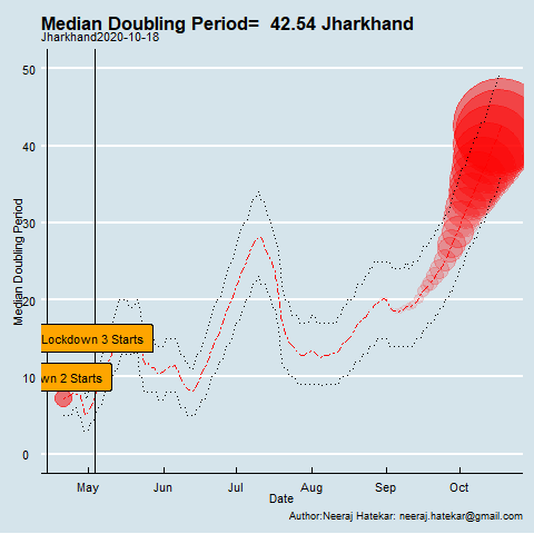 Doubling period is the time taken for x number of cases to become 2 x in any state. The larger the doubling period, the better it is. The size of the red ball inn the visualizations show the doubling period at any time. If it is becoming bigger and bigger and going up, then it is god. If it is becoming smaller and going down, the state is facing a problem.